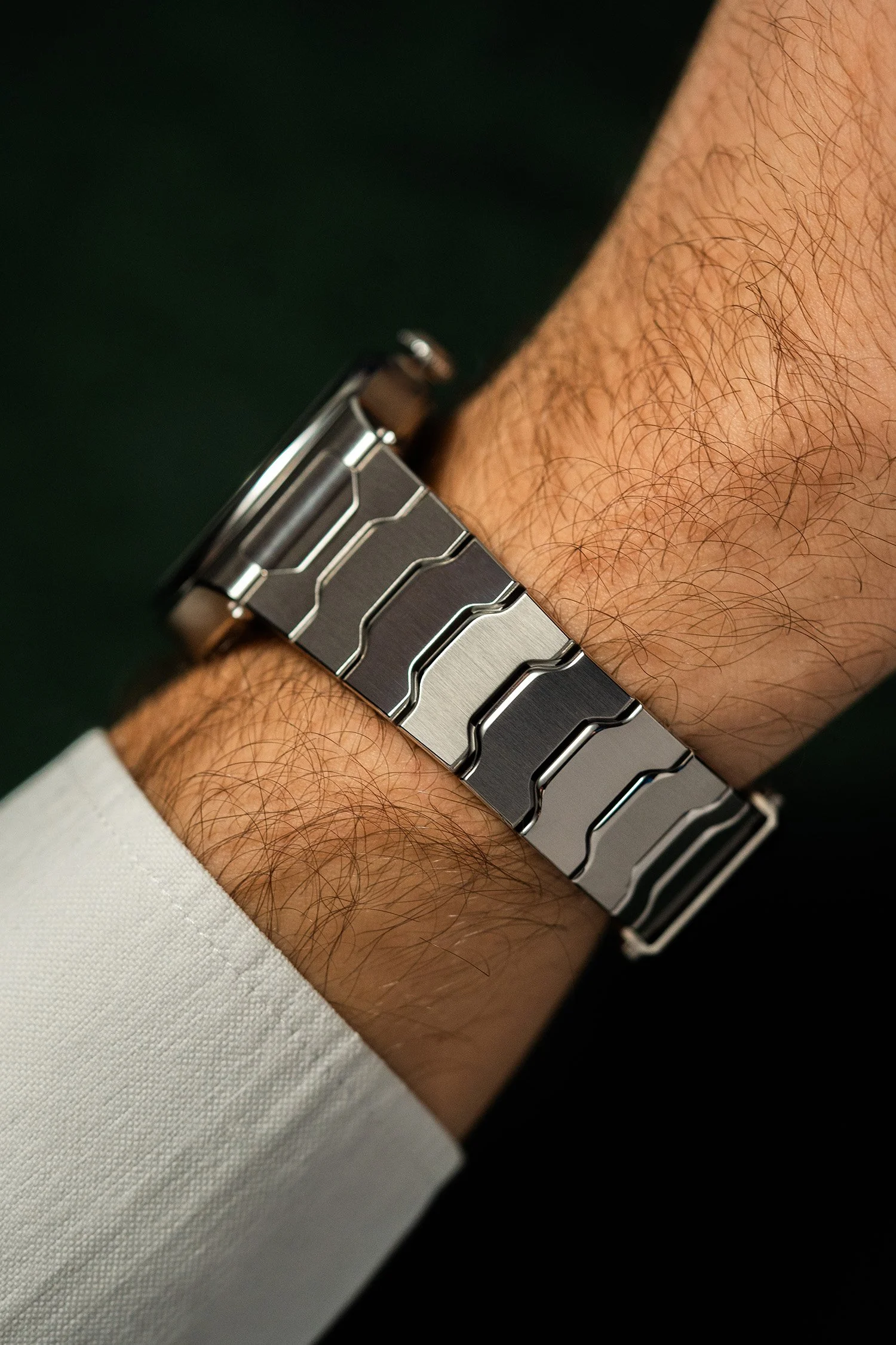 Integrated 316L stainless steel bracelet tapered from 22mm to 18mm, satin brushed throughout with polished beveled edges and micro-adjustment on the clasp. Additionally, custom-made leather straps are available upon request. Mesh bands and FKM rubber straps are scheduled for future release.